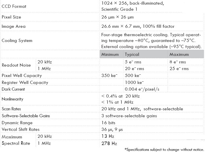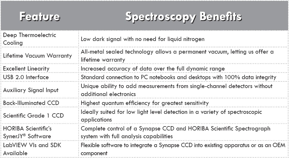 HORIBA Scientific背照射VS 1024×256 CCD卓越量子效率使得该探测器非常适用于可见和近红外弱信号光谱应用。 该检测器更适合于峰值窄的发射光谱。