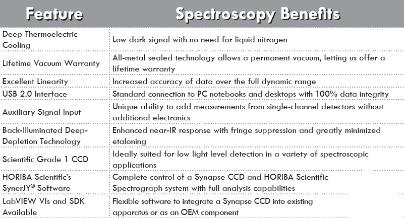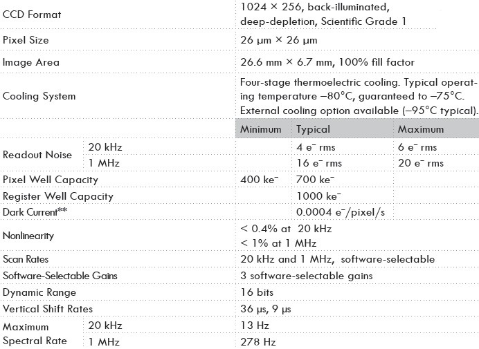 基于QExtra量子效率增强和边缘抑制技术,HORIBA Scientific的Synapse背照射深耗尽1024×256 CCD是近红外(300-1050 nm)中光谱应用的最佳选择,包括拉曼,光致发光 ,和荧光光谱。 用于电压或电流源的专用辅助模拟输入。 极高的线性度(在20 kHz时> 99.6%),这对于吸收,反射率,化学计量学,量子产率和辐射测量至关重要,具有高达95%的峰值量子效率。