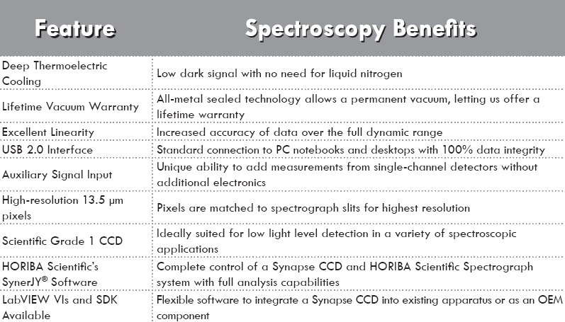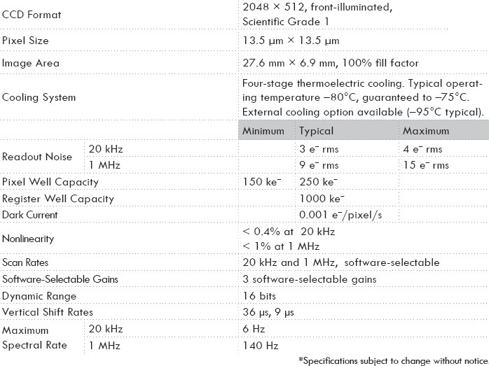 HORIBA Scientific前照射VS 2048×512 CCD是弱噪声光谱采集的理想选择。 其13.5μm×13.5μm像素提供非常高的光谱分辨率,设计有低噪声放大器,极低的读出噪声。 该芯片的高度使其成为可见光到近红外光谱区域或需要最高分辨率时多道测量的最佳选择。