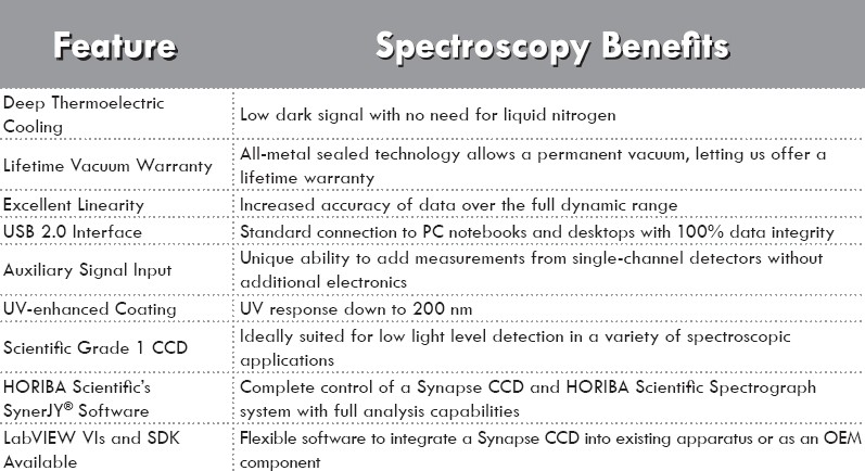 HORIBA Scientific前照射UV 2048×512 CCD是UV和可见光谱所需的弱噪声采集的理想选择。 其13.5μm×13.5μm像素提供非常高的光谱分辨率,设计有低噪声放大器,极低的读出噪声。 该芯片的高度使其成为UV到可见光谱区多道测量的最佳选择。