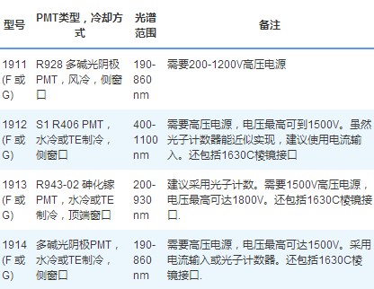 光电倍增管(PMT)探测器一般要比固态探测器的灵敏度高得多,在紫外/可见及近红外范围内效率高。然而,它的光谱范围一般被限制,到950nm左右截止,此外PMT还需要高压电源供电。