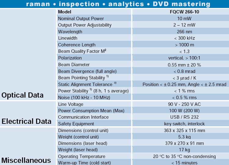 FQCW-266系列激光系统是具有二阶频率转换的二极管泵浦固态激光器,发射第四谐波266nm波长的激光。 在二次谐波发生器(SHG)中,DPSS激光源1064nm处的基波辐射转换为532nm,然后谐波束在第四谐波发生器(FHG)中转换为266nm。 激光系统配备有自动晶体移位器(ACS),可以增加FHG单元内非线性晶体的寿命。由于是单纵模,激光器提供极小的带宽和极大的相干长度。 激光束具有近似高斯形状(TEM00)的衍射极限参数。