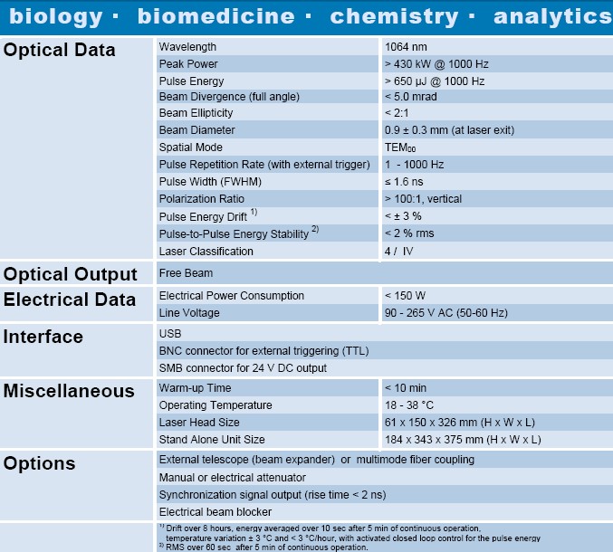 由于激光系统的特殊技术设计,工作在单横模,具有高峰峰值脉冲功率稳定性,良好的功率输出稳定性以及短脉冲持续时间。 激光系统紧凑,重型的结构允许用户将激光头和控制装置轻松集成到其系统中。该系统包括被动Q开关脉冲激光器,工作在不同重复频率的单脉冲模式下。 有两组MOPA系统:一组是单发模式,频率能达到1 kHz,另一组从1 kHz到20 kHz(MOBA266-200mW)。 它也可以由外部触发源触发,也可以通过特殊的软件命令触发内部触发源。可通过USB接口发送简单的命令对脉冲能量输出进行调节。 激光系统适用于便携式设备和分析仪器。