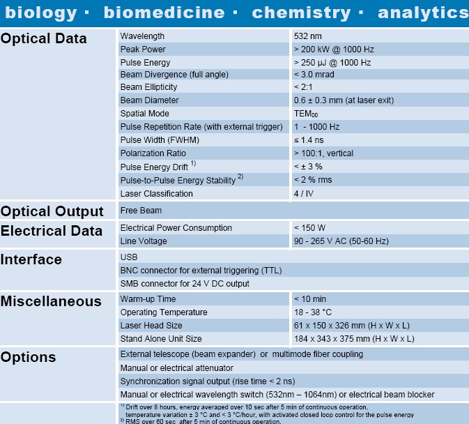 由于激光系统的特殊技术设计,工作在单横模,具有高峰峰值脉冲功率稳定性,良好的功率输出稳定性以及短脉冲持续时间。 激光系统紧凑,重型的结构允许用户将激光头和控制装置轻松集成到其系统中。该系统包括被动Q开关脉冲激光器,工作在不同重复频率的单脉冲模式下。 有两组MOPA系统:一组是单发模式,频率能达到1 kHz,另一组从1 kHz到20 kHz(MOBA266-200mW)。 它也可以由外部触发源触发,也可以通过特殊的软件命令触发内部触发源。可通过USB接口发送简单的命令对脉冲能量输出进行调节。 激光系统适用于便携式设备和分析仪器。