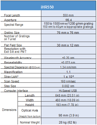 iHR是imaging high resolution的缩写,顾名思义,iHR 系列光谱仪具有优异的成像能力和高光谱分辨率。如下图所示,iHR 成像光谱仪的外形很独特,它不同于您在实验室中常见的长方形对称式光路,而是采用了非对称式的Czerny-Turner 光路结构。所有的设计围绕着三个重点:优化成像质量、消除二次衍射光、实现光通量最大化。