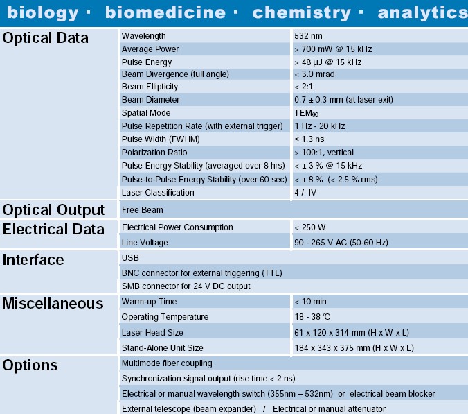 由于激光系统的特殊技术设计,工作在单横模,具有高峰峰值脉冲功率稳定性,良好的功率输出稳定性以及短脉冲持续时间。 激光系统紧凑,重型的结构允许用户将激光头和控制装置轻松集成到其系统中。该系统包括被动Q开关脉冲激光器,工作在不同重复频率的单脉冲模式下。 有两组MOPA系统:一组是单发模式,频率能达到1 kHz,另一组从1 kHz到20 kHz(MOBA266-200mW)。 它也可以由外部触发源触发,也可以通过特殊的软件命令触发内部触发源。可通过USB接口发送简单的命令对脉冲能量输出进行调节。 激光系统适用于便携式设备和分析仪器。