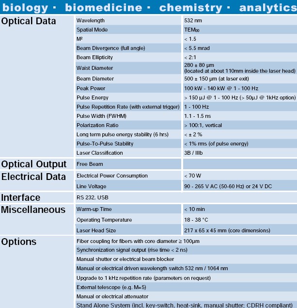由于激光系统的特殊技术设计,工作在单横模,具有高峰峰值脉冲功率稳定性,良好的功率输出稳定性以及短脉冲持续时间。 激光系统紧凑,重型的结构允许用户将激光头和控制装置轻松集成到其系统中。 它是脉冲激光器,在单脉冲操作中,重复率在1Hz至1 kHz之间,重复频率取决于激光系统和外部触发信号。 可通过RS 232或USB接口的简单命令调节脉冲能量输出。 OEM激光系统适用于便携式设备和分析仪器。