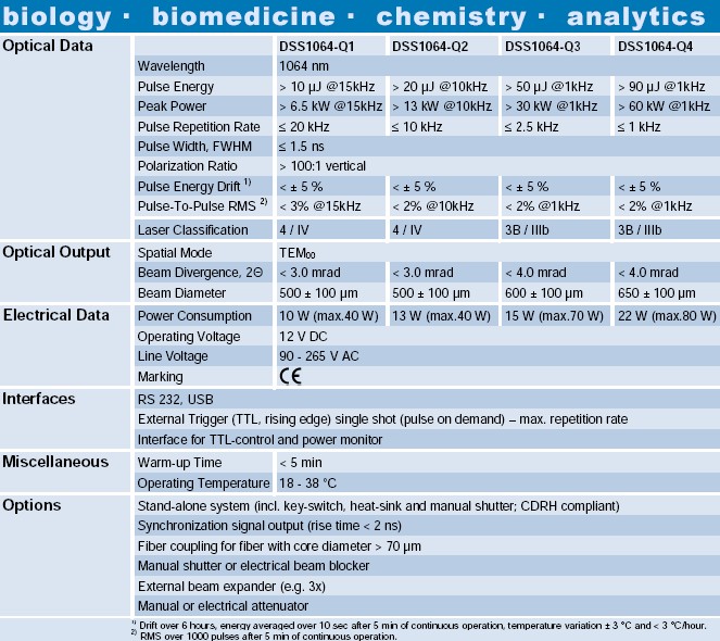 从红外到深紫外范围的激光光谱广泛应用于生物学,生物医学,化学分析,微加工和环境技术等方面。CryLaS提供在213 nm,266 nm,355 nm,532 nm和1064 nm波长的被动Q开关激光器(DPSS),它具有极其出色的光束质量。
