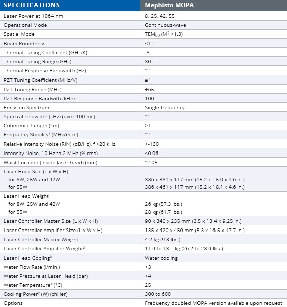 Mephisto MOPA是一款高功率单频连续固态激光器,专为低噪声科学研究和OEM应用而设计。 激光器的独特稳定性源自广泛认可的非平面环振荡器(NPRO)的性质,该振荡器是MOPA子组件的核心。 MOPA展现了其他商业产品无法比拟的光学性能,如1 kHz超窄线宽或极低强度噪声(-130 dB / Hz RIN),这是由于集成了噪音抑制(NE)技术的结果。 用户可以通过调节温度和PZT,完全控制发光频率。 MOPA的波长为1064nm,功率为8,25,42和55W。 可根据要求提供倍频激光器。