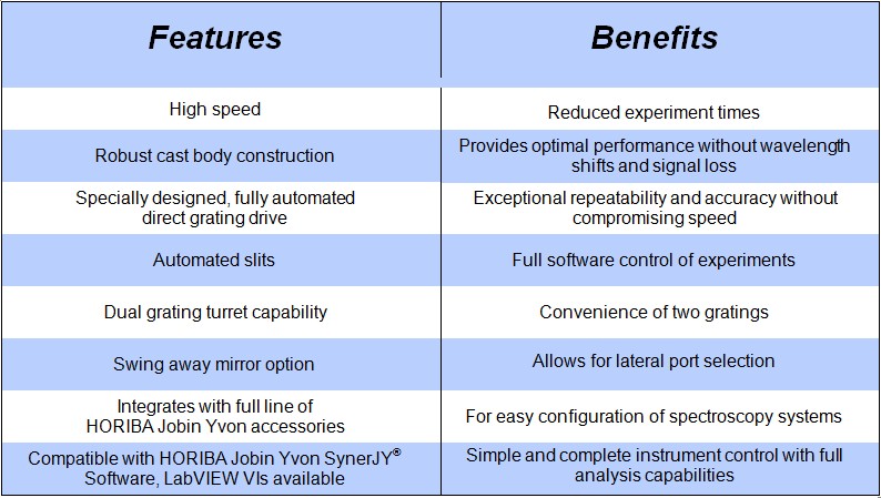 光栅驱动器具有大于300nm /秒的光栅速度,显著地为用户减少了实验时间。 配备全自动波长驱动器和自动化狭缝,FHR可用于多个单色仪和光谱仪配置,配置双出口,可以安装阵列检测器和HORIBA Jobin Yvon全系列配件。 优异的设计,FHR是用于快速采集和获得高质量结果的理想的长焦距光谱仪。